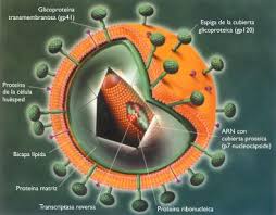 - El virus realmente esta dentro del virión formado por: una cápsida cónica, dos copias de ARN de una sola hebra positivo, las enzimas transcriptasa inversa (transcribe el ARN a ADN) e integrasa (integra el ADN viral transcrito en el ADN celular)